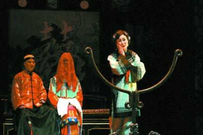 然而,这种京剧文本的文学性尝试却带着“自讨苦吃”的意味,文本中的意向比如“三十年前的月亮”,“晴天的风像一群白鸽子钻进他的纺绸褂里去,哪儿都钻到了,飘飘拍着翅子”,这些都无法用舞美和唱词来实现,原来张爱玲文字的画面感变成了编剧的障碍,而唯一的解决办法就是 “虚实结合”:“我们把这些意象都放下,从掌握张爱玲的总体意象——华丽、苍凉入手。如在长白婚礼开始时,我们就请编唱腔的老师来一段婚丧杂糅的音乐,唢呐能表现婚礼的喧哗热闹,也能表现丧礼的悲鸣苍凉。导演在画面处理上也是如此:将三爷拜堂的婚房与七巧和瘫子二爷的房间叠映在一起,两个场景相叠映的‘蒙太奇’表现一种转换的时空。 ”