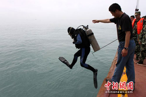 5月1日,国内多家媒体赴广东省汕头市南澳岛登上了正在这里进行水下考古作业的“南天顺”打捞船。图为水下考古人员实施潜水作业。作 者:林春伟
