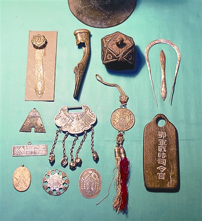 昨日,在其武昌家中,朱汉昌向记者展示了他所收藏的部分绘制有“双旗”图案的辛亥纪念实物,包括当时的革命将领使用的佩剑手柄、军政府的出入证、纪念章、各类佩饰、碗碟等,其材质涉及金、银、铜、铁、纸、木、瓷、皮、布等。