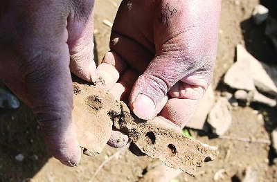 昨日,在鹿泉北胡庄的发掘现场,考古队队员们正在探沟(方坑)内进行仔细清理,记者看到,40个方坑整齐地排列成两排,离方坑不远处就是陕京三线输气管道工程的施工现场,“这个遗址就是在输气管道工程进行过程中被发现的。”考古队负责人说,他们已经进行了一个多月的发掘工作,目前挖掘面积已达近 1000平方米。