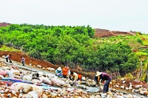 由于库区蓄水的需要,工匠们正在麦坪遗址上方修建堤坝。