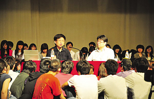 当晚,在开讲前一个小时,剧场外就已经人群熙攘、水泄不通。大家或站或席地而坐,甚至连易教授发言的舞台上都挤满了学生。所以易中天只能坐在“水桶阵”里讲禅宗。