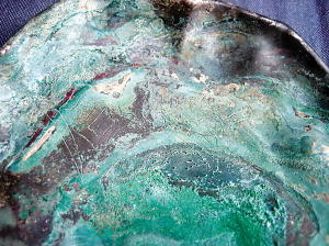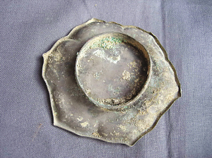 昨日,南京的吕先生来到本报,他从包里取出一件带锈迹的银盘,称是多年前在白下路附近一处建设工地捡到的。记者看见此银盘整体呈黑色银锈,直径大约8.5厘米,局部有绿色锈,呈六棱形,边口有折沿,还有圈足。盘内錾刻着“皇后饭囗”四个楷书大字。字体规整,排列整齐,银盘内并无其它纹饰。吕先生指着四个楷书字样说:“也许读作‘囗皇后饭’,其中一字,因有浮锈遮住,暂时无法认出。”