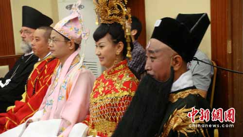 中新网深圳5月13日电(记者 郑小红)装扮成包拯、利玛窦、六祖慧能的演员,13日下午在“粉墨”亮相此间举行的肇庆参展文博会新闻发布会,为肇庆文化造势。这些人物,都曾在广东肇庆留下历史印记。