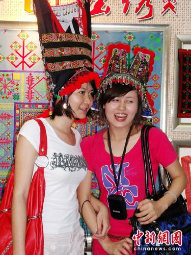 许多青年男女看到美丽的瑶绣服饰时,都忍不住穿戴整齐拍照留念。北京游客李琳秀在瑶绣展厅前排队排了20多分钟,才轮到穿瑶服戴头饰照相的机会。