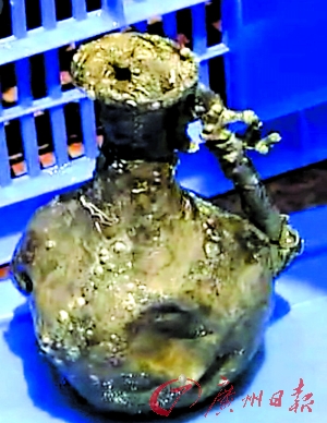 昨日的打捞中首次出水了锡壶。出水的锡壶共有2件,光泽、颜色均已不见。孙键说,壶的风格是典型的明代风格,比较简练。