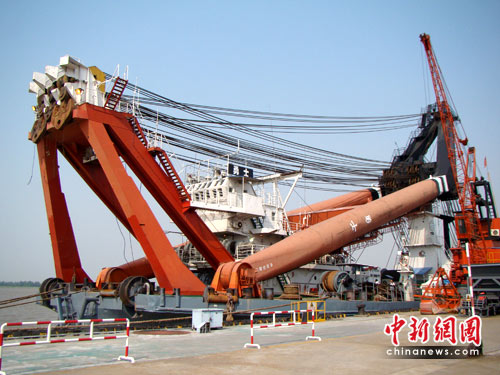 中新网镇江5月24日电(盛如平 董文浩 朱晓颖)24日,江苏镇江焦山“瘗鹤铭”残石打捞在即,“勇士”号浮吊船抵达并停泊在索普码头,等候进入打捞作业水域。