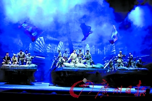 此外,在舞台的二度创作中,导演着重刻画英雄群像中每一位英雄的个性特征,“例如都是描述牺牲,但都有不同的景观,三个战士最后是唱着二人转抱在一起撞向敌船,营长夫妇是在战场上相遇并一起为守卫阵地牺牲,而政委是牺牲在船桅杆上。”