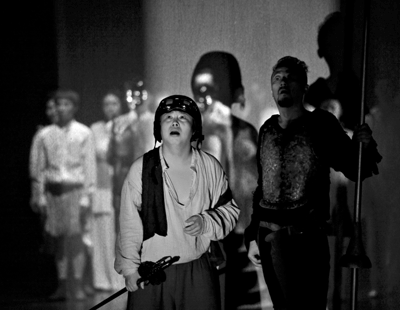 把80万的小说在两个半小时内演完,这对孟京辉来说也许不是一个问题。因为这一切完全可以通过简化舞台和使用多媒体的方式解决,而这一切正是孟京辉这几年玩得很起劲的。此外,孟京辉还不忘记他的“实验性”。在去年9月北京的首演中,记者看到,孟京辉在400多年前的故事场景中竟故意使用了大量灯管,还让三个穿裙子的男演员大跳西班牙舞,嘴里却说着带东北腔、上海腔和陕北腔的台词。“这一切不是搞笑。”孟京辉昨天解释说:“这是为了拉近观众的距离,作为激发他们想象力的催化剂。”