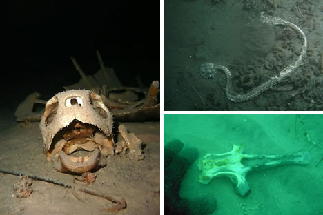 我们曾想象着在海底看到各种海洋动物骷髅的场景,左边的这幅照片是一具海龟的骷髅。它被发现于马来西亚Sipadan岛附近的“海龟墓地”中。右上图是一条狼鳗的尸骨,而右下图则是不知名的动物尸骨的一部分。