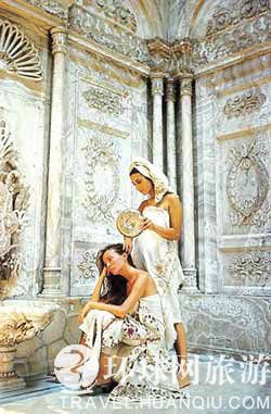 土耳其人的婚姻习俗,有一种传统的独特的仪式,叫“新娘澡”。那就是在婚礼前一天,新娘或她母亲邀请一些女友女眷去澡堂洗澡。亲友到齐后,新娘由人领着在澡堂里转一圈,亲吻长辈们的手。新郎的母亲向新娘的头上撒钱或赠送表示吉祥如意的礼物,姑娘们在音乐伴奏下歌唱起舞。“新娘澡”有时从白天一直持续到夜晚。仪式进行时,新娘脚趾要染成红褐色,并规定由婆婆染右脚趾,由媒婆染左脚趾。
