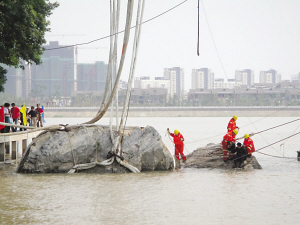 昨天下午,镇江市政府在焦山南麓举行了盛大的《瘗鹤铭》疑似残石打捞启动仪式。记者在现场看到,4股共8根特制高强度尼龙缆绳,已经从不同部位将疑似巨石牢牢“网”住。记者同时获悉,4日下午1时起,央视新闻频道将现场直播打捞第一块巨石全过程。