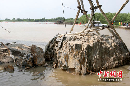 中新网镇江6月4日电(赵国财 唐娟)4日下午,首块《瘗鹤铭》摩崖石刻疑似残石被巨型“勇士号”浮吊船吊起约半米后发生碎裂,首次起吊被迫终止。在打捞人员下水清理碎石后,传来最新消息。《瘗鹤铭》打捞项目现场总指挥王雷介绍,碎裂的石头不会对其他三块预备打捞的石头造成损坏。相较于首块残石,他更寄希望于压在该石下面的残石。他表示,争取一周后展开第二次打捞。