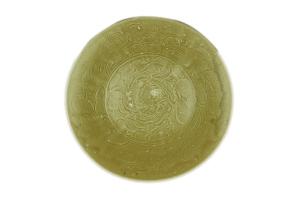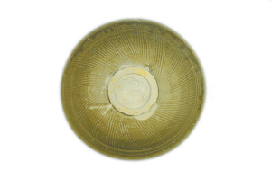 枇杷黄、釉色润、深腹、敛口、小圈足的小碗,碗口以下弧线内收,器内壁划刻简笔花草间配“之”字形篦纹,器外通体划刻折扇纹,这种特色的中国瓷应“珠光”大师之名被誉为“珠光青瓷”,驰名世界。