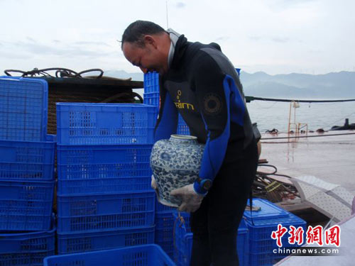 据打捞队崔勇队长介绍,在之前的打捞中,出水的都是瓷器碎片,此次是首次出水完整的瓷罐。