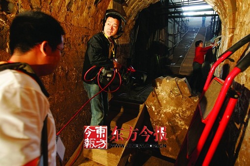 在墓穴底部,有一堵高约1米的土墙,记者注意到,墙内镶嵌着一些砖瓦片,已经露出。据考古人员介绍,在12日的发掘中,考古人员极有可能剥开该堵墙,至于有无重大发现,值得大家期待。