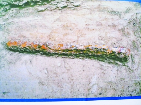 昨天中午,在工作人员的引导下,记者来到1号墓发掘现场。该墓墓底离地面13米多,有二三名考古人员雇用的村民正在清理土层。清理后的土层中发现有一堵土墙,土墙里面嵌了不少碎砖瓦片,土墙距底部1米多高,后面用钢支架撑着。墓底还有几个方坑,但这些坑到底是干什么用的,有待探讨。