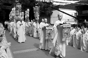 7:50,迎请法会结束,栖霞寺住持隆相法师跪拜之后,小心翼翼地捧起了锦盒,向朝天宫的东门走去,传义和曙光两名法师随行两侧护卫。