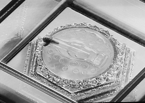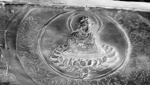 圣物供奉在全国工艺大师王殿祥亲手设计制作的楠木刻金宝座上。这两套楠木刻金宝座直径有15厘米,高度为12.5厘米,宝座底座和下三层都是浮雕,图案主要是一些莲花等佛教纹饰,上面三层是莲花花瓣。最上面一层采用圆雕手法“绽放”出朵朵莲花。两个宝座采用楠木雕刻,贴附金箔,宝座金光熠熠,庄重而华贵。