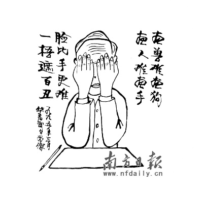 廖冰兄有一幅著名的漫画《自嘲》,辛辣刻画了一些人在“瓮破”之后仍然瑟瑟发抖的形象。华君武也有一幅《自画像》,但画中人却没有露出面孔,华君武这样风趣地自嘲说:“我是画不了素描的嘛,当然也就画不了自画像。怎么办?只好画了一个人,双手紧紧地把脸捂住。”