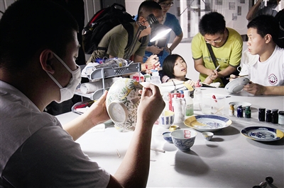 现场修复间与外面的文物展示区仅隔一道玻璃,观众在展示区参观圆明园出土瓷片和老照片时,也可以近距离观看文物修复过程。