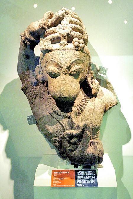 记者在2007年河南博物院举办的“西天诸神”展览中见到过来自印度国家博物馆的石质“神猴哈奴曼胸像”(左图)。这件神猴雕像虽然只存上半身,但形象确实酷似孙悟空。