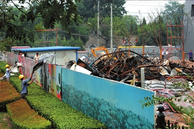工棚已彻底被烧毁,工人将着火时崩到围挡外的彩钢板扔进院内。本报记者朱嘉磊摄