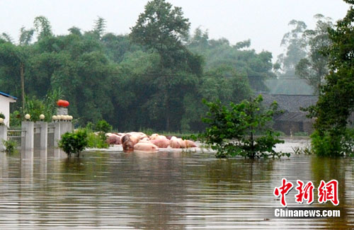 18日早上,中新网记者在受灾严重的重庆潼南柏梓镇看到,虽然雨已经停歇,但镇上的洪水仍未褪去,多条街道的积水仍有半人深。洪水完全包围了当地的一个养猪场,近百头被淹的活猪成片浮在水面上,据该场工作人员介绍,该猪场养的6000多头猪均被洪水淹没,仅17日便死了1000多头猪。因猪场受困之处水位较深无法救援,猪场场主只能眼睁睁看着猪被洪水冲击漂浮。