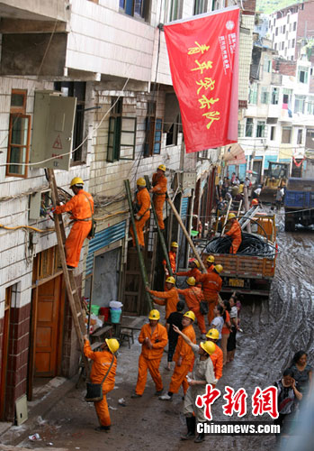 据成都电业局抗洪抢险突击队负责人钟守熙介绍,从21日早上6时起,突击队就投入到抢修江陵镇供电系统恢复、户表换装工作,经过15个小时的连续奋战,突击队在抗洪抢险的第一天就完成了1000米电缆线的架设,115支户表的安装,还有300多户表的供电恢复将全部在23日结束。