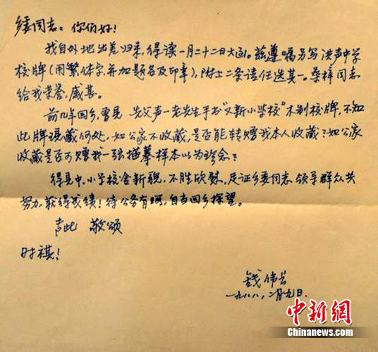 中新网无锡7月30日电(记者 洪晓红)一代科学巨匠钱伟长今天辞世,记者赶赴其出生地无锡新区鸿山街道七房桥村,意外发现了一块由无锡当地人保存完好的匾额,据介绍,这是一块钱伟长生前念念不忘的由其父钱声一先生亲笔镌刻的老校匾。
