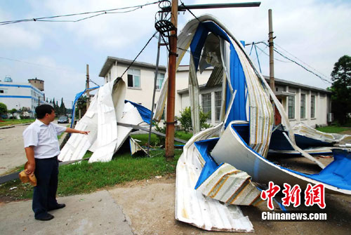 8月19日,在江西九江市庐山区五七二七厂区内拍摄的被大风掀翻的铁皮屋顶挂在电线上。 作 者:胡国林