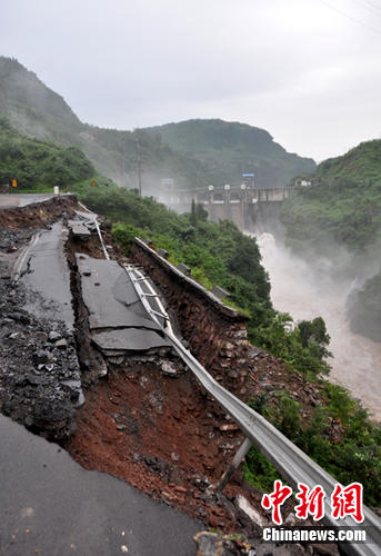 21日上午9时,120米长的路基深陷深度已达4—5米,其中25米路基和道路内侧临时车道也垮塌,滑坡同时还引起上行线路出现裂缝,国道108线交通已完全中断。该路段位于花滩电站水库大坝下方、荥河河道正上方,地势陡峭,一旦出现大面积塌方,泥石将直接滚入河道,很可能形成堰塞湖,后果不堪设想。