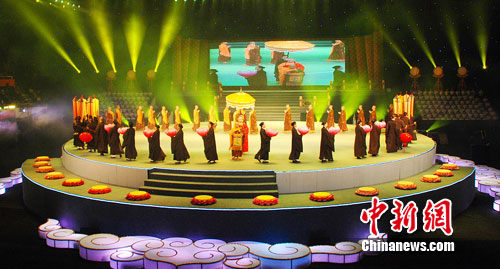 中新网广州9月9日电(莫非 程景伟 廖宴思)“祝福广州亚运,促进社会和谐”。9月9日晚,2010广东禅宗六祖文化节在广州开幕,广东省副省长雷于蓝、国家宗教局副局长张乐斌,以及海内外高僧大德、专家学者和各界人士约4000人参加开幕式活动。