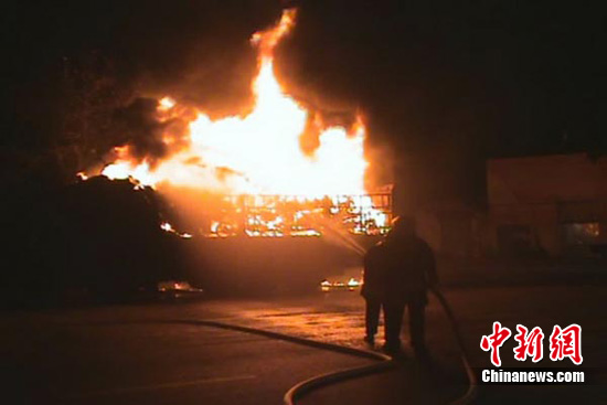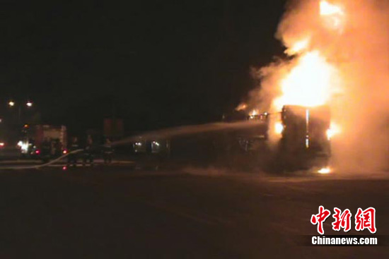 中新网淮安9月13日电(衡中强 闫大伟 朱晓颖)12日晚19时09分,江苏淮安市西安路工业园区附近一辆大货车突然起火,车上托运的100多辆摩托车、电瓶车全部被烧毁。