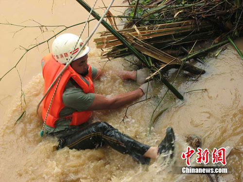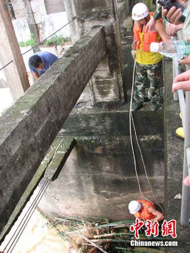 大坝闸门下,水深近6米,水流异常湍急,洪水也异常冰冷,且堆满了垃圾,虽然消防官兵做好了安全保护,并关好闸门,下游也安排了渔船随时准备救人,但是水下的情况不明,一不小心就有被洪水冲走或被水下杂物扎伤的危险。在其中靠近岸边的一个孔闸门,大树与竹子卡在闸门的中间,闸门无法放下,消防官兵只能在异常湍急的水流中作业,由于缺少着力点,水下的消防官兵多次没入水中,险象环生,经过近20多分钟的作业才将杂物捆住。