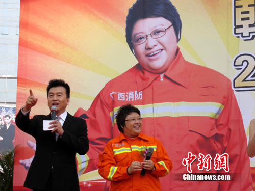 中新网南宁11月8日电 (记者 王刚)11月8日,韩红出任广西消防宣传大使暨2010年广西“119”消防宣传活动启动仪式在广西南宁举行。应广西公安消防总队聘请,空军政治部文工团副团长、著名歌手韩红应邀出任广西消防宣传大使。在活动现场,身着消防救援服的韩红在消防知识问答环节,将其亲民形象发挥得淋漓尽致,引来了台下观众的阵阵笑声。