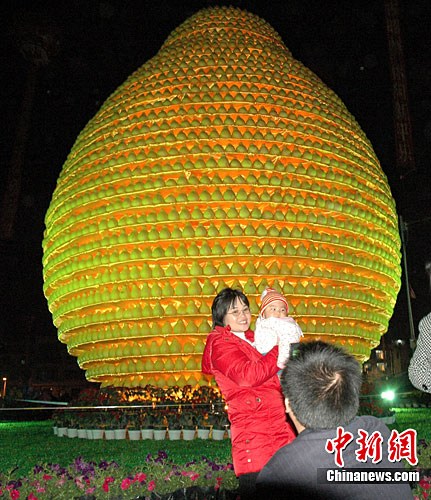18日晚,一个罕见的巨型柚灯矗立在桂林市平乐县马河体育场。该柚子灯宽6米、高8米,全钢架结构,约需5吨左右的钢材。整个柚灯共有36层,由花篮和柚灯两部分组成,底部一至三层摆放鲜花组成花篮,往上的33层则摆放了6666个柚子鲜果。黄昏时分,华灯初上,“柚子灯”内灯光闪烁,金碧辉煌,蔚为壮观。