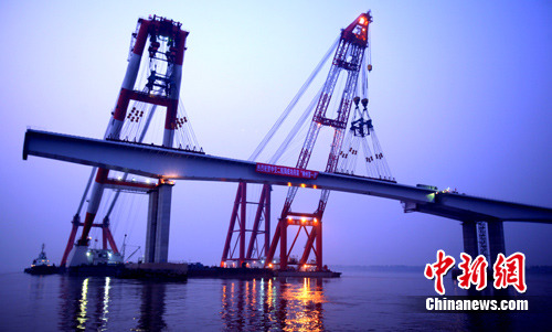 中新网南京11月19日电(记者 崔佳明)记者从崇启大桥指挥部获悉,2010年11月19日17时58分,堪称神州第一梁的崇启大桥首节185米钢箱梁吊装成功。