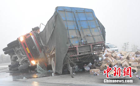 在事发现场,一辆满载瓷土的中型货车与一辆满载油漆的大型货车发生迎面相撞后,中型货车侧翻在大型货车驾驶室的上方,两车紧紧靠在一起。中型货车上的驾驶员受了一点轻伤自行爬出,大型货车上的两名人员被困车内,生死不明。