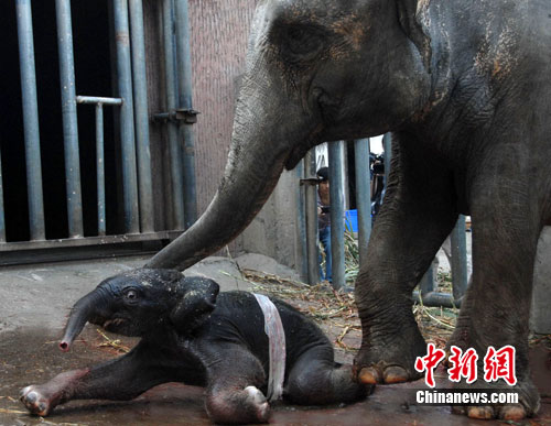 经过饲养员多次仔细辨认,这是一头小“男”象。小家伙刚来到这个世界就显出“男子气概”,还没站稳就大大咧咧地沿着栏杆走起来,象妈妈担心地紧随其后。果不其然,刚走了五六步就摔了个大跟头,还好,小象天生的自我保护意识,象鼻一卷正好与身体构成一个大圆环,没有受到丝毫伤害。摔倒了再爬起来,如此往复几次,小象走路越来越稳当了,还一路从外运动场走进了内室。