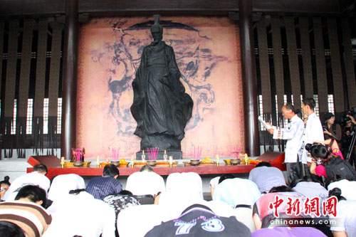 下午15时许,屈氏后裔登上位于凤凰山顶的大殿,那里安奉着从归州镇乔迁至此的屈原青铜像。屈氏后裔面对屈原像依次上香、献祭,并行跪拜叩首大礼长达十数分钟。