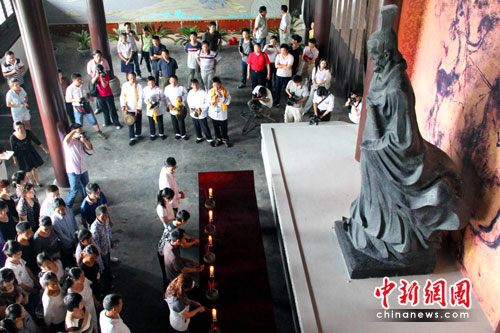 中新网秭归6月13日电(记者刘良伟 郭晓莹 上官纯青)13日下午,秭归屈氏后裔60余人带着果品、香等祭祀用品,一路涉江乘车到达凤凰山屈原祠祭拜祖先屈原。据悉,这是千百年来当地第一次大规模组织屈氏后裔涉江至屈原祠祭拜屈原。