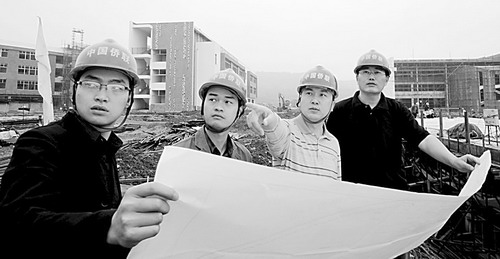 。学校建成后可容纳5200名学生在校学习。今年9月1日,北川中学校园将正式交付使用。图为施工现场的工程技术人员。