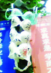 帖子中的文字很简单,只有两句话:“7月2日晚上,青岛某大学毕业生最后的疯狂。向化工学院制药某女生宿舍致敬 !”楼主很明显是崇拜的语气。文字下面有五张照片,每张照片上都有不同数量的女生胸罩在校园里飘扬。记者数了数,一共是14个胸罩,大部分都写有文字。