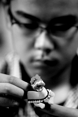 15岁、1米8的身高,强壮的男孩子并没有对篮球场上的拼抢产生兴趣,却痴迷于坐在桌前对着小面球精雕细琢,郎佳子彧已经想将捏面人当成一辈子的事业。身处世家,孩子自然从小就跟随着叔、父、姑等亲属,边看边动手,5岁的时候,已经有了像模像样的作品。“我愿意一辈子干这个,我觉得我能坐得住。”