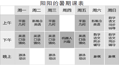 13岁的李信阳是上海市普陀区一所公办中学的学生。暑假期间,每周一、三、五上午9时到11时30分,他都要去读一个平面几何专题学习班;周一、三、五晚上6时,参加游泳培训班……