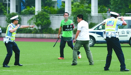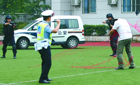 15时07分,一辆警车开进操场,8名全副武装的飞龙突击队员跳下车门,迅速包围操场中央圆弧。他们身穿多功能战术背心,头戴防弹头盔,手握冲锋枪,大腿外侧还佩戴着手枪。“放下凶器”,一名突击队员通过扩音设备两次喊话,但两名持刀男子拒不就擒。