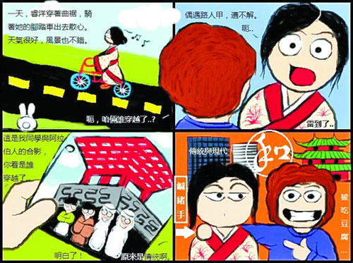 浙大城院“崇正雅集华服社”是今年上半年才组成的团体,目前已有成员近30人,他们因爱好汉服,喜欢传统文化而聚在一起。虽然还没有正式成为社团,但因其“穿汉服逛世博,传扬中国传统文化”的活动,成了城院出镜率最高社团之一。社长魏斌为了推广团队,亲自用鼠标绘制了原创连载漫画,每期内容包含一个传统文化典故。既有笑点又有卖点的招揽方式,引得不少学生跟帖表示愿意加入。