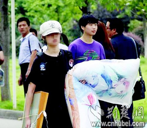 发帖人小伟是该校动画学院的一名大一新生。他告诉记者,小时候经常一个人在家睡觉,由于怕黑,只有抱着枕头才能入眠,后来便成了他睡觉时的习惯。从小到大,他只有抱着大枕头才能睡得香沉,心里才感到踏实。为让他适应大学生活,上大学前,家人特地给他买了一个1.2米长的动漫抱枕陪他“睡觉”。