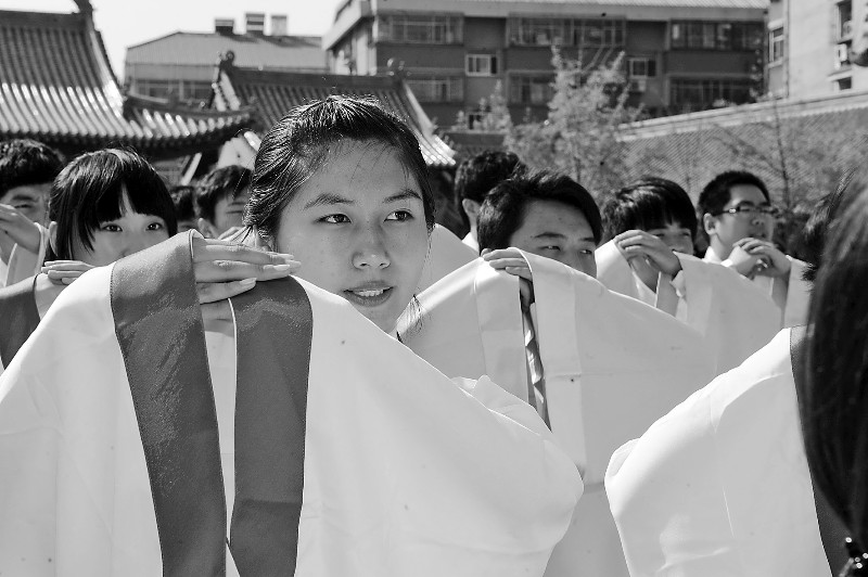 上午10点半,济南府学文庙开放庆典仪式结束后,18岁成人礼仪式隆重举行。在身着汉服的男司仪的主持下,56名来自济南艺术学校的18岁学生身着汉服列队缓步穿过大成门,走上大成殿月台,在此庄重地举行成人礼仪式。据介绍,从1998年起,每年的9月24日被定为“济南市十八岁成人节”。这是自成人节设立以来,在济南府学文庙第一次举行的大规模成人礼宣誓仪式。